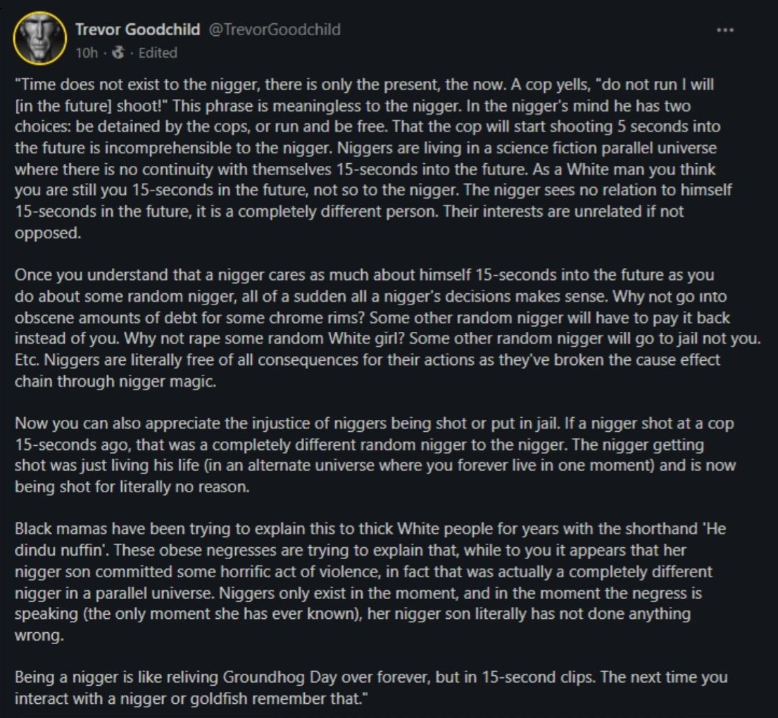 If there is undeniable evidence and video proof of niggers doing shit like this, life in in prison is not nearly enough. There should be torture and immense pain inflicted upon the niggers 1000x what they did to their victims before they're killed. Their families should be forced, even tied down with their eyelids forced open like something out of Clockwork Orange if necessary to prevent them from averting their gaze, while they watch the unimaginable pain and suffering inflicted upon their nigger relatives. Even niggers from the community that are acquainted in form to the perpetrators should be forced to watch and threatened that they even try anything else at all, this is the fate that awaits them. Nigger criminals must live in a constant never ending state of fear that their lives can turn into the worst horror movie possible at any moment for their actions.