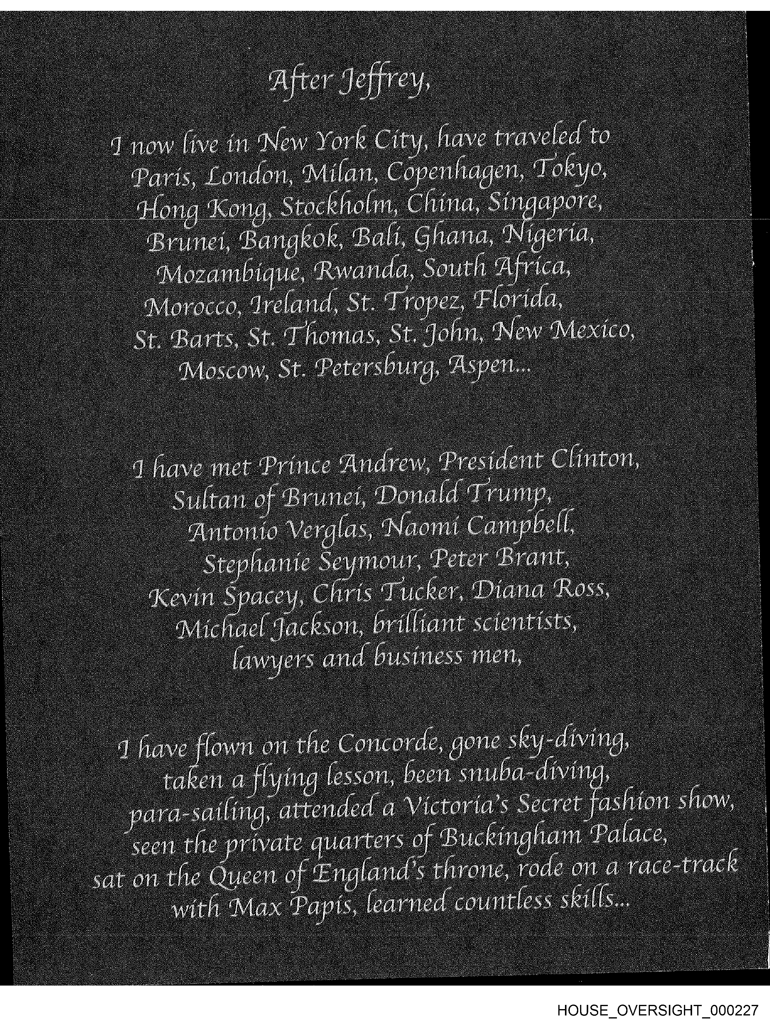 >>524332680After Jeffrey,now Cfvejlt yorf City fiavé traveled toOaris, Condon, Milan, Copenhagen, fofyo,China, SiTi aprå,'Brunei, $angfOfej Oa qn,aita, Vertå,frtozantbque, fRwanJa, South Rfrfca,Morocco, frerand} StiffOpeZ) florddø;St. Barts, St. f homasy SteJofin„ 'Mew 'Mexico,Moscow, St Tetersburø, aspenq nave net Trince 'Andrei% Tresidettt Clinton,.Stiftanof$rt4TieiEOoitaCdcrrump,"Antonio Vei81qs, Naomi Campbell,Steffianié) Seymour -Peter Brant,OCevin S acey Chris fucfer, rDfönø Ross,elflacfson brilliant scientists,lawyers an(büsines$q have [fown on the Concorde, bone sry-diving,ta énuffiJft18 lesson, been_yara-sailing, attende(a Victoria's Secret ashion show,seentfieyr(vate quarters of Bucfinufiønt QØlqce;sat on the Queen of England's throne, rode Ott a race-trac€with Max Tapis, learned Countless sfeiCCS4&+HOUSE OVERSIGH