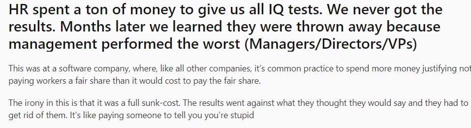 >>524339459You don't realize how bad things are, CEOs and people at the top are usually there by pure luck and are the worst possible people for this position.They are dumber than even the average jeet too. The only thing they know is how to lie and look short term.In my company for instance they introduced "productivity monitoring software" recently, which basically means that they expect that you have X mouse inputs and Y keyboard inputs for Z hours a day. This translates to management not being able to figure out what work is important, so they measure it by the number of inputs per day. This resulted in me not caring about any of the work, I just spam mouse and keyboard and that's that, do my worst every time. Who gives a fuck if the management is braindead?