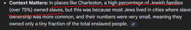 >>524338016Vast majority of the Jews lived in the north, Jews in places like Charleston made very small portion of Jews in America.>>524338144Especially in the south. 50% of whites in South Carolina owned slaves while Jews numbered less than 1200 people in SC.