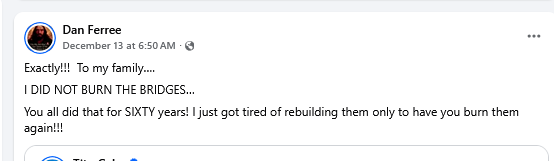 >>524343097You're obviously ignoring the fact that he was insane before the Epstein files released.>his face book is: dan.ferreeHis public facebook account. Go through it yourself. He's a very broken person.
