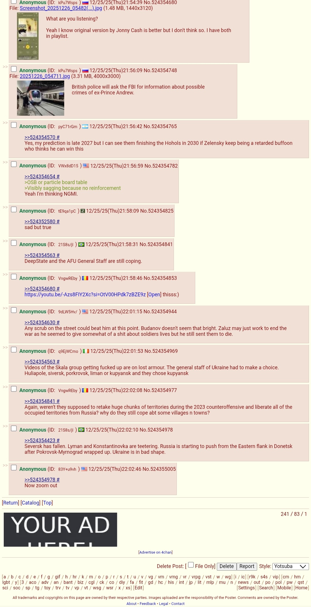 >>524347447Same shit. The latest big happenings I remember are Bakhmut and Kursk Oblast, and they were like... three years and one year ago respectively? Since then it was all like>RFAF is on the outskirt on some small town>RFAF controls half of said small town>RFAF fully controls that small townRepeated ad nauseam, with "UAF retook some small village" sometimes.