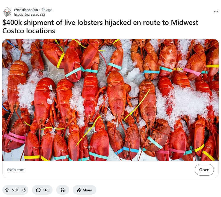 Imagine the thieve's reaction. They probably thought they were stealing a truck full of tvs or computer components or designed shoes. And instead they open it up have thousands of live lobsters.