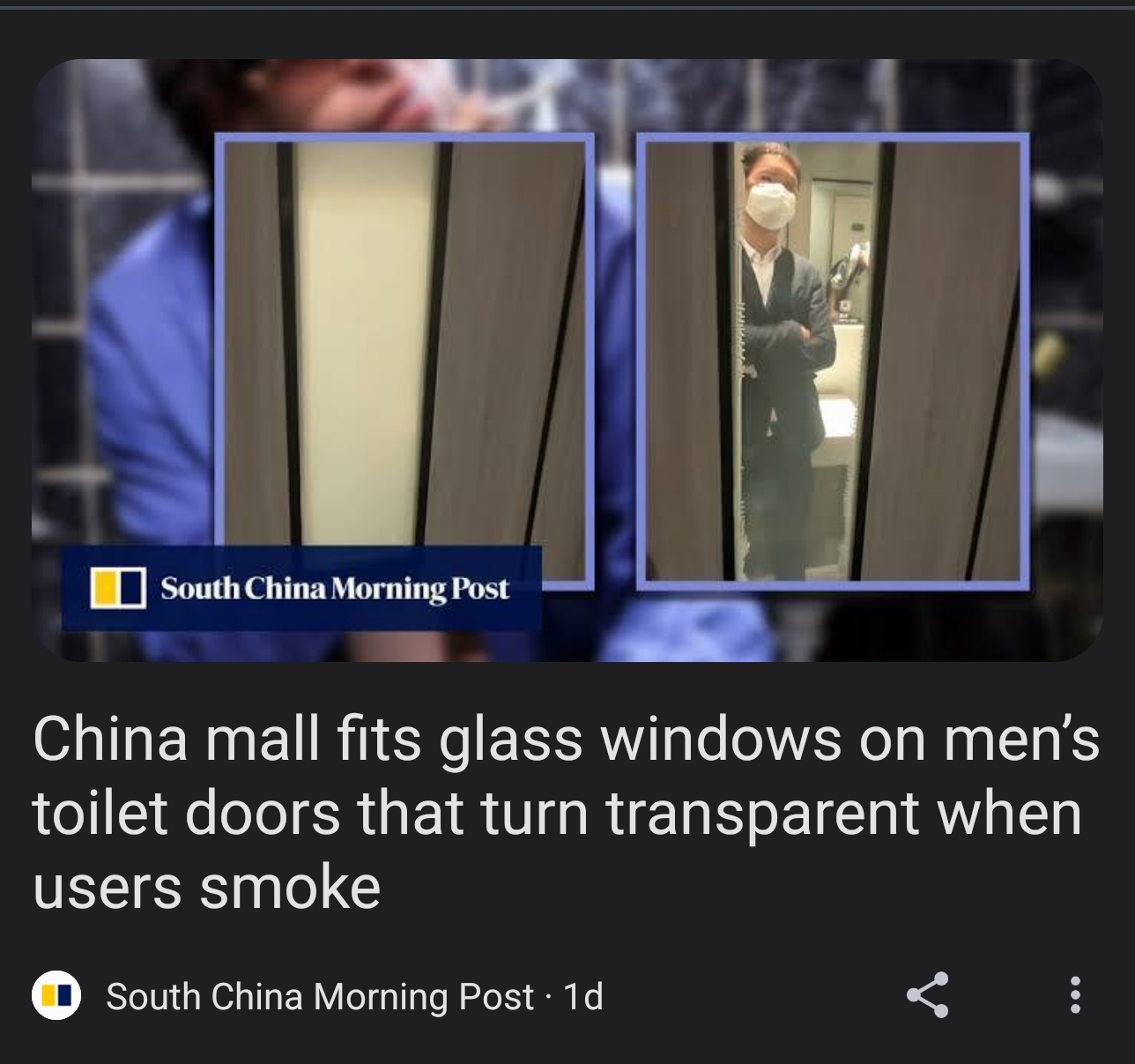 You best start believing in 1984-style dystopian futures, YOU'RE IN ONE. https://www.scmp.com/news/people-culture/trending-china/article/3336723/china-mall-installs-glass-windows-mens-toilet-doors-turn-transparent-when-users-smoke