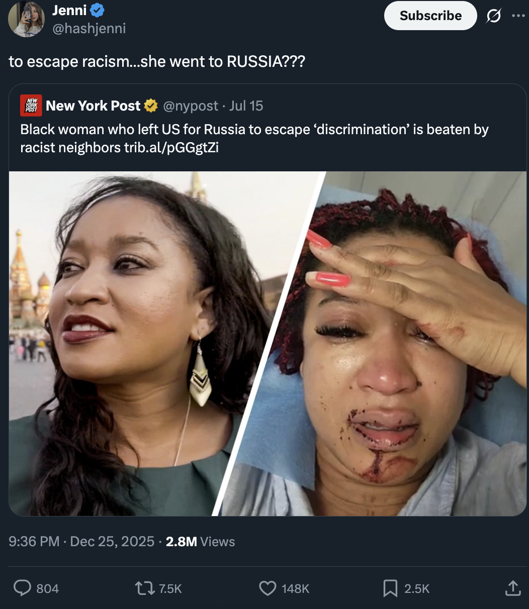 >>524371420Shes probably fell for leftoid propaganda, the one that portrays Russia as this anti racist anti imperialist gentle giantShe should have gone to Africa with her brothers and sisters I wonder why she didnt lmao