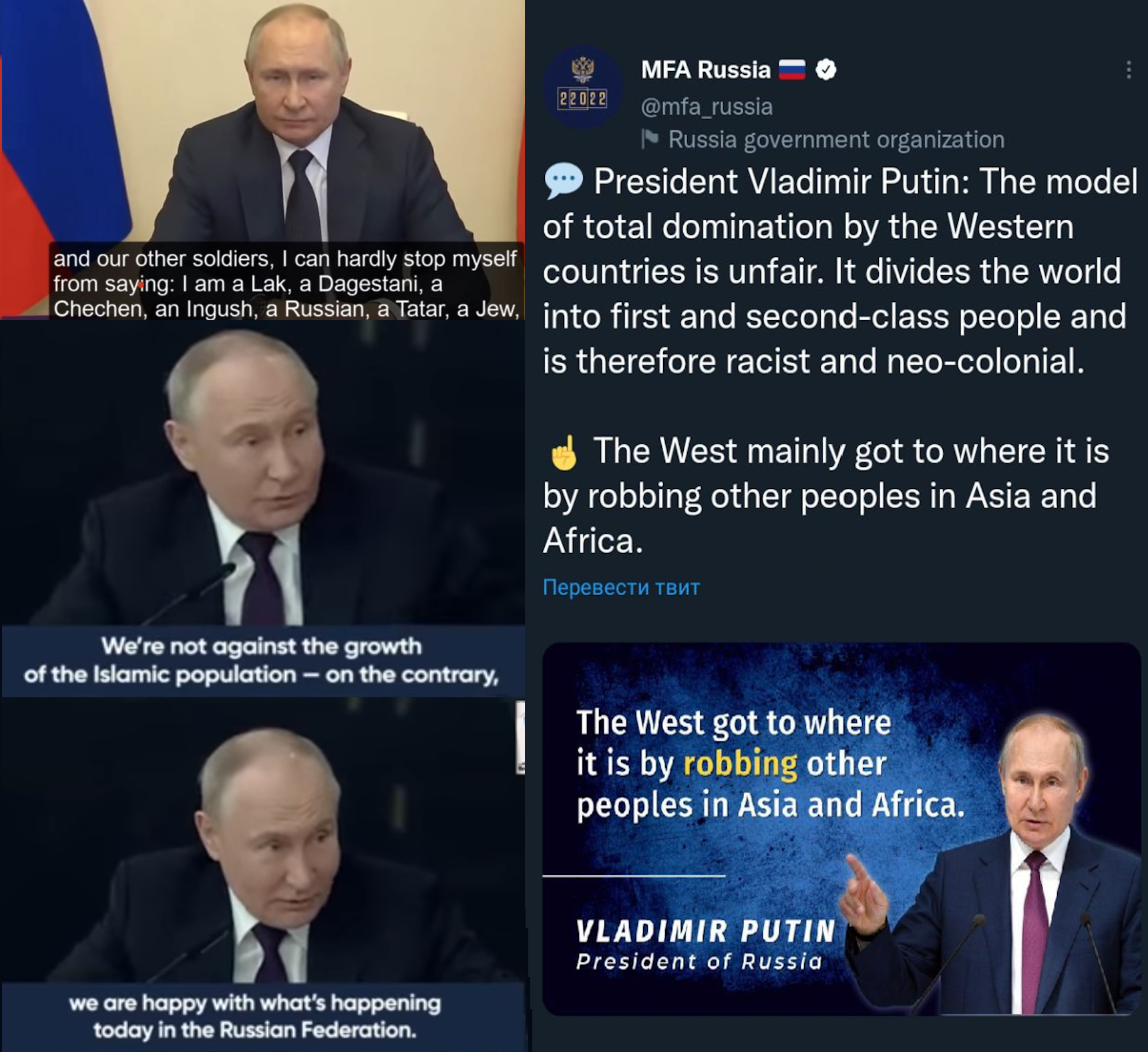>>524372297This, how can people call it western or leftist propaganda that Russia is "anti racist anti imperialist gentle giant" like >>524371589 it's literally all Russia's own claims, as protector of the global South against big bad racist 1st world whites