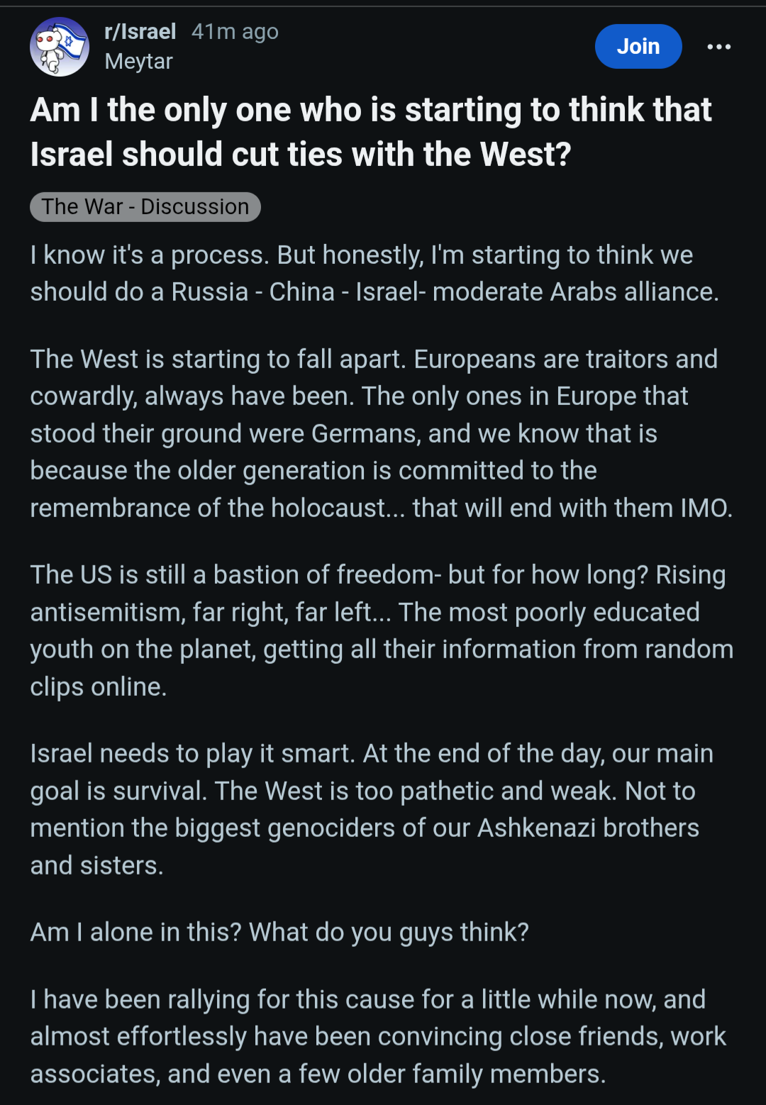 The post doesn’t make sense since Russia, China, and the Middle East don’t like Jews or isreal