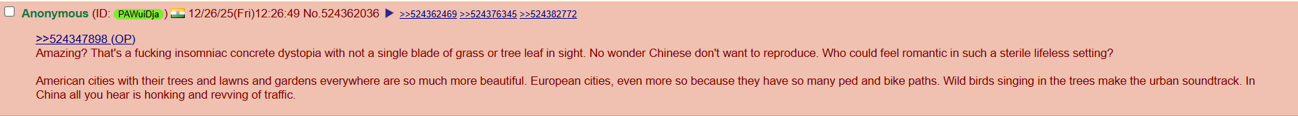 why on earth is an indian speaking something like this given that their cities are shit tier?their words are filled with irony.i would rather be in the poorest city in china than any indian city rich or poor.Also his logic makes no sense, if chinese cities are the reason why china's fertility rate is so low, then why did he praise european and american cities, given that europe and america's fertility is also low