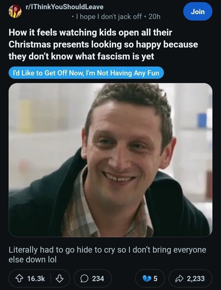 They have to convince you that their bullshit tax laws are needed. To do that they need to be alarmists at every chance. Even Christmas becomes a “dead inside” meme at that point
