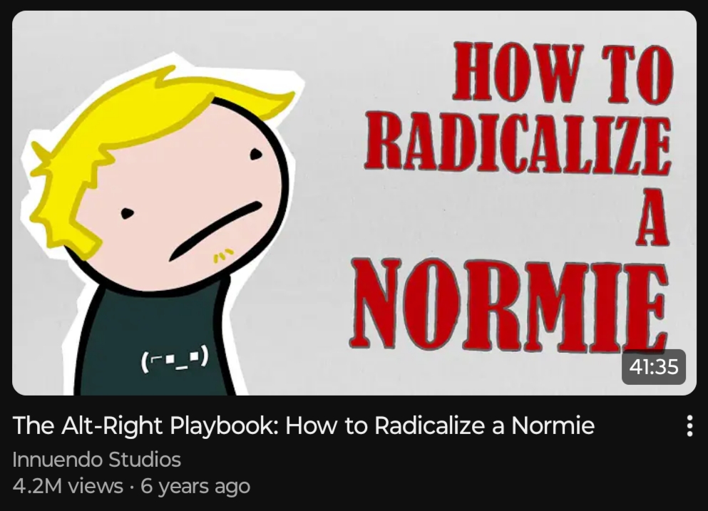 >>524399047>The Alt-Right PlaybookI watched a few of these videos once, because I was in my enlightened „consider all sources” era.they have no fucking clue about right-wing beliefs (or even conservative beliefs in general), about radical right-wing culture, arguments, sensibilities - nothing.this is literally someone shitting out things they think are true based on equally detached articles, straight into their own mouth.it’s a message by clueless retards to clueless retards, to justify why they can jerk off to their ideology.