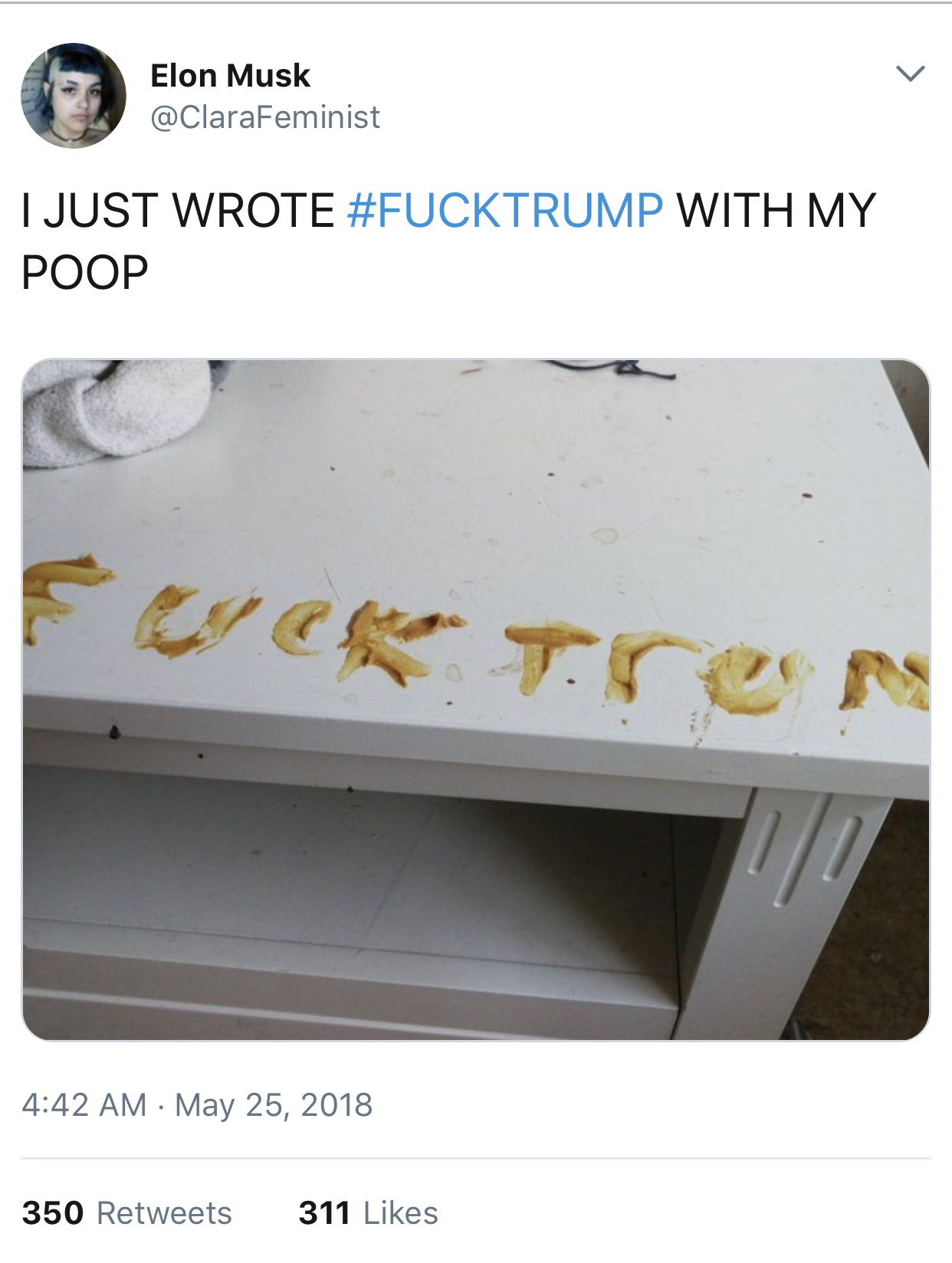 >>524399683>GUESS WHAT LIL DONNIE I JUST SMEARED SHIT ON MY DESK AND IM GONNA EAT ON IT LATER WITHOUT CLEANING UP FIRST