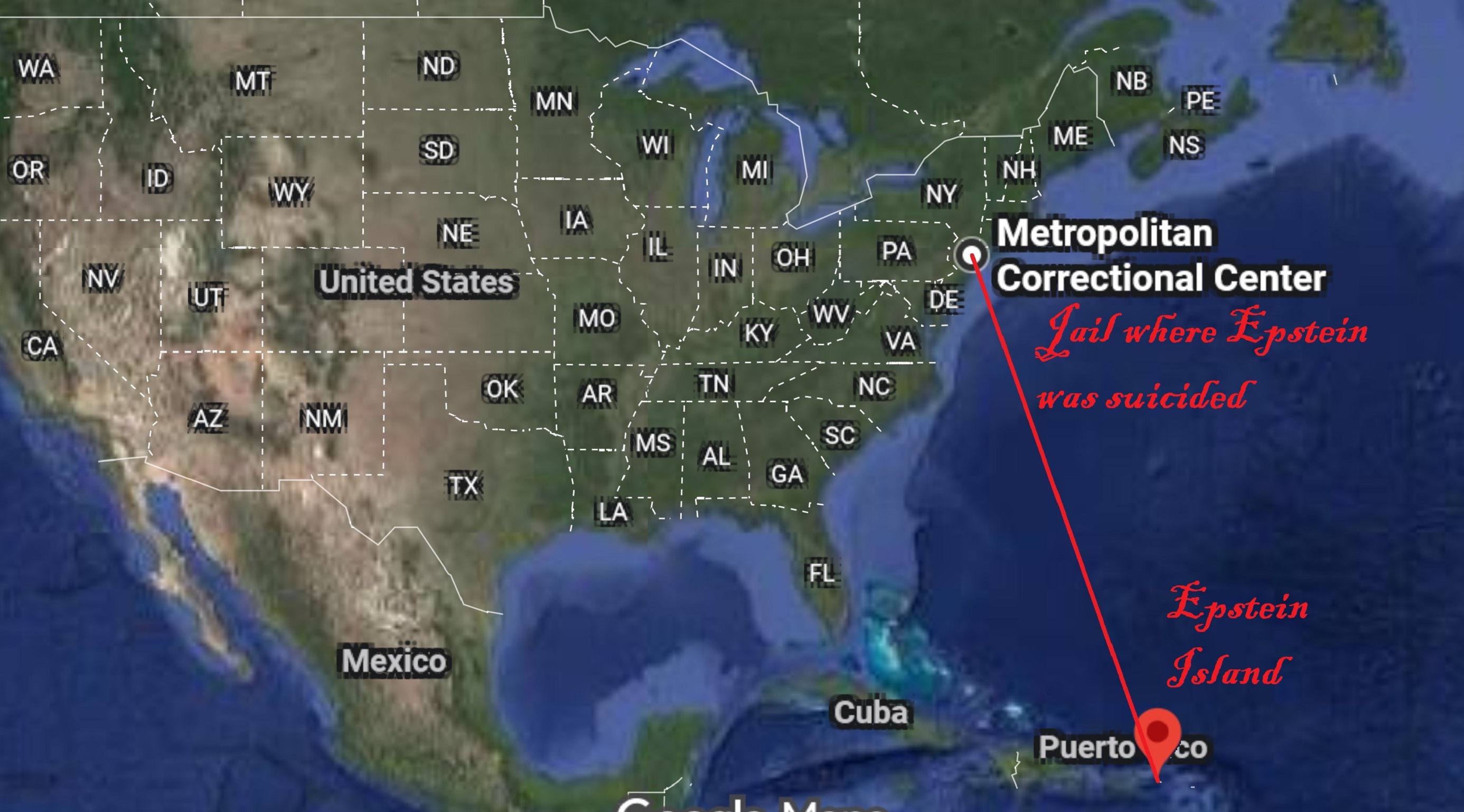 Explain to me how we're not living in a fucking simulation. If you look at a map then you'll quickly see how epsteins pedo island and the jail where he was killed are on a STRAIGHT FUCKING LINE. Shit like this doesn't just happen by chance. They are clearly hiding something and people will just pretend that it only happened by chance to gaslight you into believing that shit like this happens.
