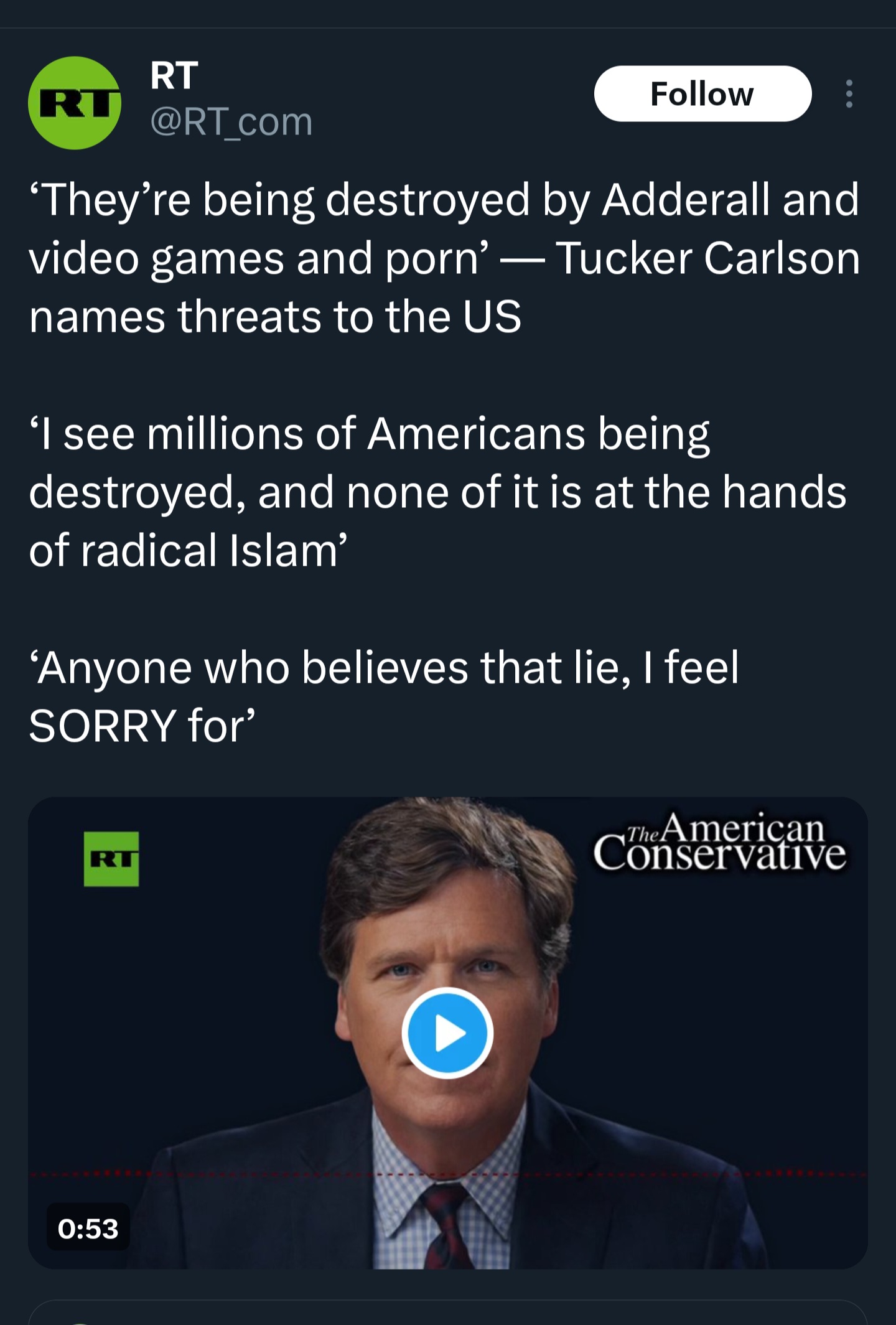 >>524407121he must have realized that muh cuckservatism isn't going to bring young men back to society, we have to go so much further than that. and that makes his relatively milquetoast self very uncomfortable.as much as Tucker claims to loath the current malaise of our country and society, he as an affluent person does not want to rock the boat too much. but it must, and it will.>>524407257yeah. the system has to make huge concessions to the young men of the floundering western societies to even begin to solve the problem, but they won't. the old guard have to die out, or be put out to pasture, before things can get better.>>524407315he's wrong in the sense that he hates the symptoms, but won't confront the disease.