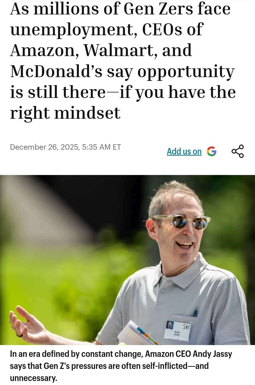 >>524407949What a man!It's real, early life is as expected.Apparently it took him some time before finding his true calling, from the article:>Jassy’s own career is proof. Long before becoming CEO of one of the world’s most powerful companies, he experimented—trying his hand at sportscasting, product management, and entrepreneurship. He also worked at a retail golf store, coached high school soccer, and tried investment banking.Just look at this picture of a man!