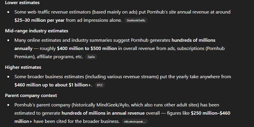 >>524434453I wasn't sure if I should be impressed but wow I thought pornhub made way more than that. OF is likely the #1 adult website by far now.