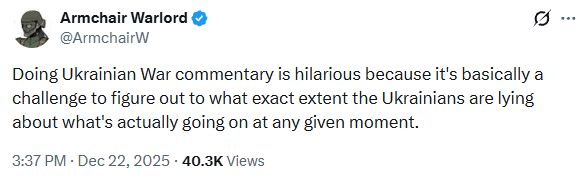 Previous: >>524438478 Day 1,403 – Daily assessment: understandingwar.org/analysis/russia-ukraine/#research▶Latest>russians have started using horses for meat assaults due to running out of armour.>Ukraine said it used British Storm Shadow missiles to attack the Novoshakhtinsk oil refinery>russia admits the loss of Kupyansk and nearby villages>putin confirms that russia is ready to import unlimited amounts of indians to make up for all the dead russian soldiers>Zelenskyy revealed for the first time 20 points of the basic document on the end of the war. Among them: Ukraine's sovereignty will be reaffirmed; The number of the AFU will remain at 800k in peacetime; The US, NATO and European signatory states will provide Ukraine with security guarantees (automatic sanctions+military response) that will reflect Article 5; Ukraine confirms that it will remain a nuclear-free state; russia will enshrine a policy of non-aggression towards Europe and Ukraine in all necessary laws and all necessary ratification documents>On December 18, Gerasimov presented even more exaggerated reports than Belousov did on December 17, suggesting that russian military officials may be competing with each other to present putin with optimistic reports - ISW>General Staff of Armed forces of Ukraine had confirmed withdrawal of Ukrainian defense forces from Sieversk, claims Ukrainian military still upheld fire control over the town>NEW DEAD rUSSIAN GENERAL: Fanil Sarvarov▶Telegramrentry.org/telosint2023t.me/ukr_pics▶Intelt.me/DeepStateENodin.tradoc.army.mil/WEG (equipment explorer)ukr.warspotting.net (visually confirmed losses)▶Mapswww.deepstatemap.live/enliveuamap.com/en▶DISPOSABLE SOLDIER (diary of a RU mobik)TOURS 1-4: files.catbox.moe/mpcw7p.zip▶12 min of TZD in one ditch (Pokrovsk area) - 28 killedfiles.catbox.moe/sxbxfb.mp4
