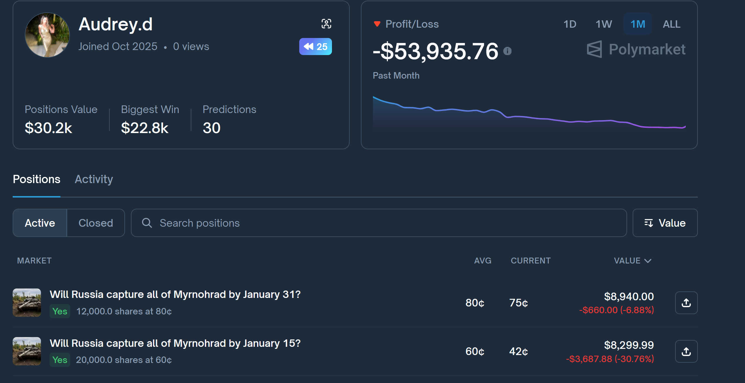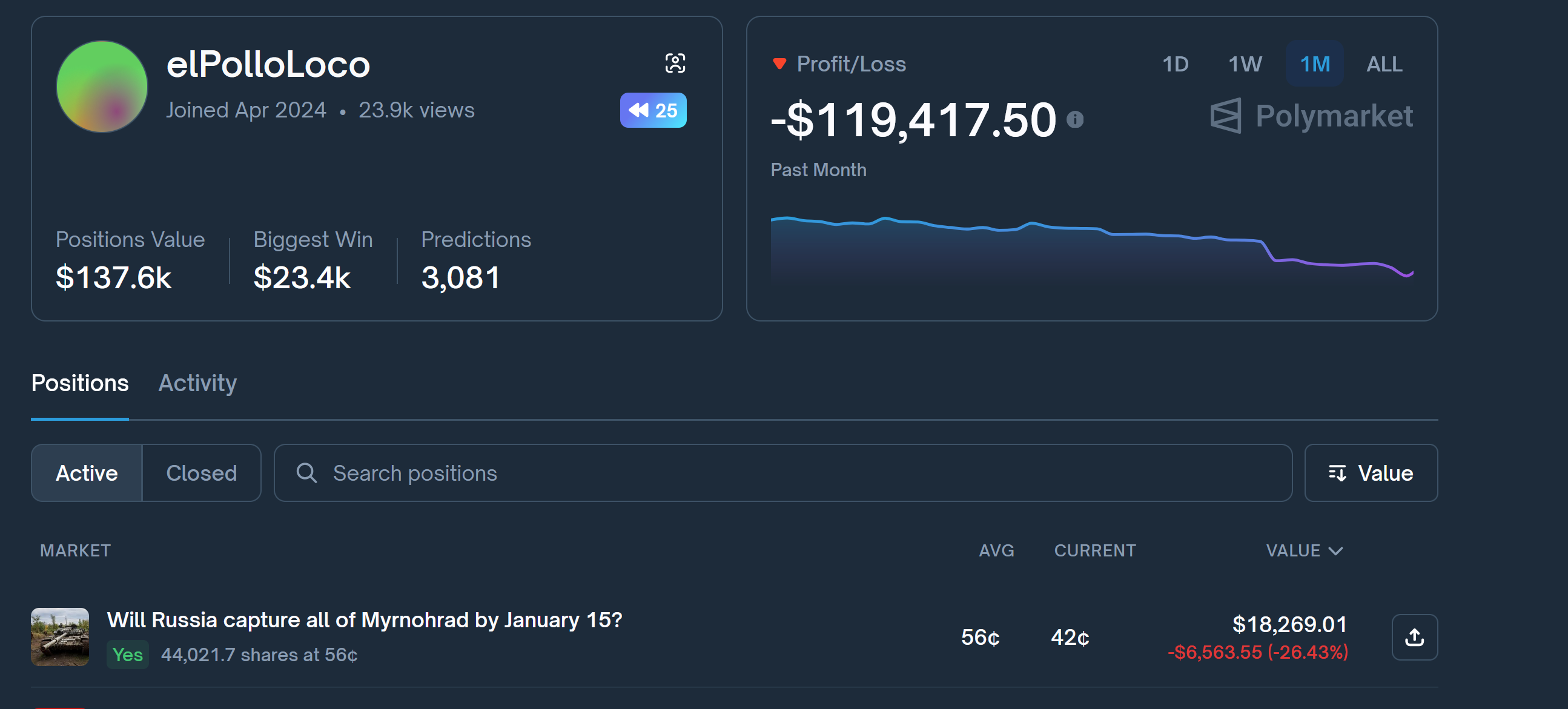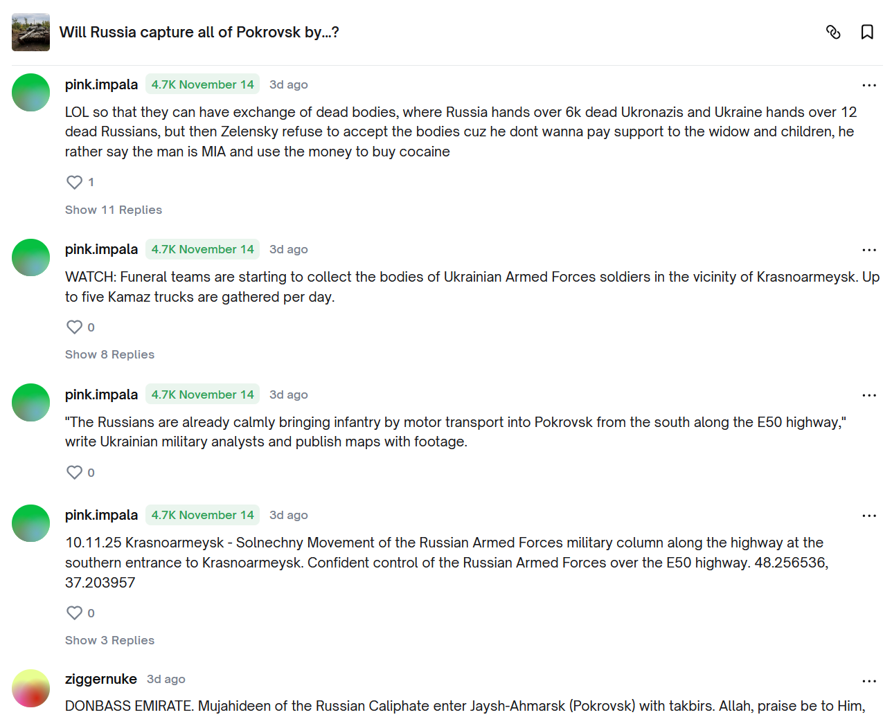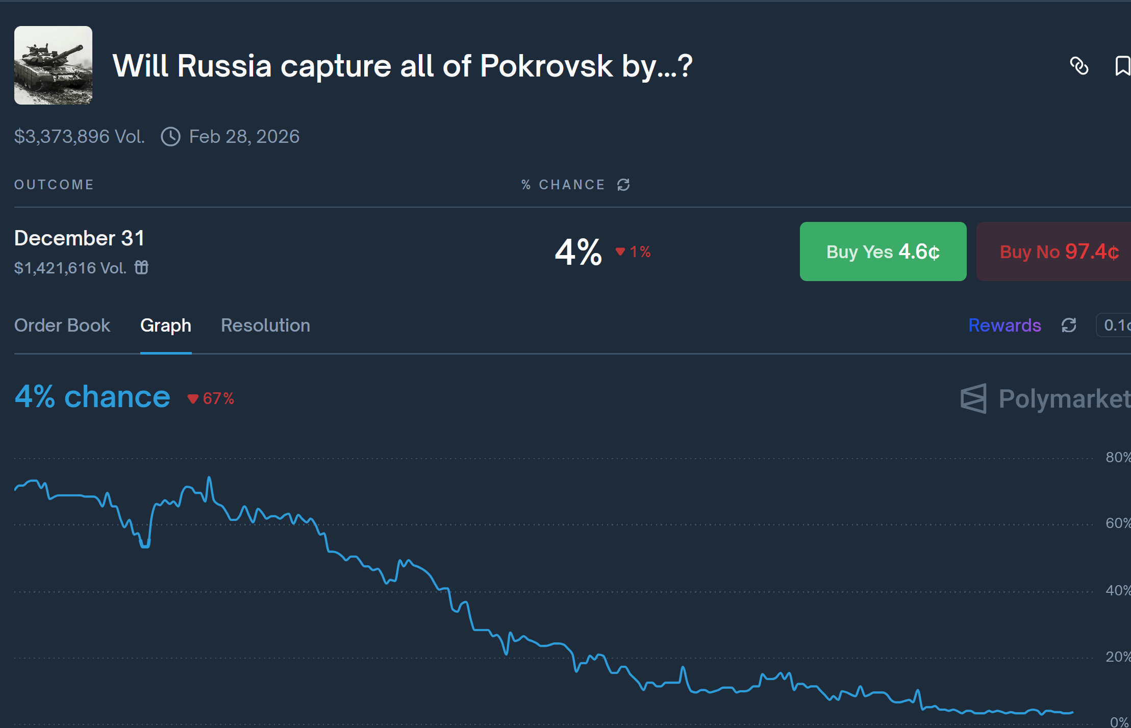 >>524461042The value of the bet falling means that Polymarket thinks it becomes more likely for ziggers to capture Myrnohrad, right? Does this happen because more people bet on Yes?