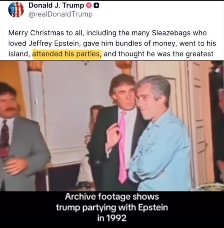 1pbtid memeflag doing 1pbtid memeflag things. Full tweet:https://truthsocial.com/@realDonaldTrump/posts/115782891296626533>Merry Christmas to all, including the many Sleazebags who loved Jeffrey Epstein, gave him bundles of money, went to his Island, attended his parties, and thought he was the greatest guy on earth, only to “drop him like a dog” when things got too HOT, falsely claimed they had nothing to do with him, didn’t know him, said he was a disgusting person, and then blame, of course, President Donald J. Trump, who was actually the only one who did drop Epstein, and long before it became fashionable to do so. When their names get brought out in the ongoing Radical Left Witch Hunt (plus one lowlife “Republican,” Massie!), and it is revealed that they are Democrats all, there will be a lot of explaining to do, much like there was when it was made public that the Russia, Russia, Russia Hoax was a fictitious story - a total Scam -and had nothing to do with “TRUMP.” The Failing New York Times, among many others, was forced to apologize for their bad and faulty Election “Reporting,” even to the point of losing many subscribers due to their highly inaccurate (FAKE!) coverage. Now the same losers are at it again, only this time so many of their friends, mostly innocent, will be badly hurt and reputationally tarnished. But sadly, that’s the way it is in the World of Corrupt Democrat Politics!!! Enjoy what may be your last Merry Christmas! President Donald J. Trump