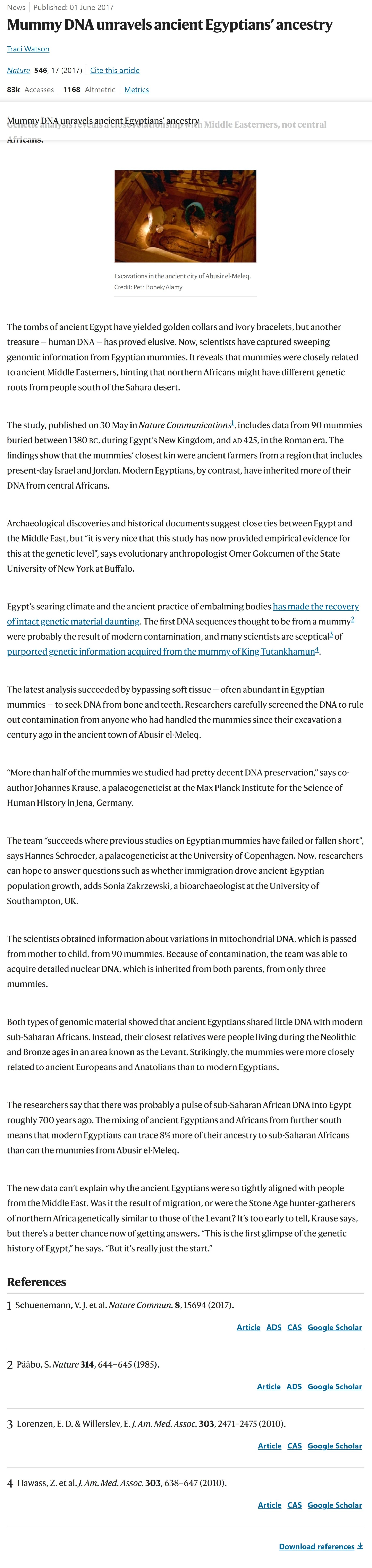 >Both types of genomic material showed that ancient Egyptians shared little DNA with modern sub-Saharan Africans. Instead, their closest relatives were people living during the Neolithic and Bronze ages in an area known as the Levant. Strikingly, the mummies were more closely related to ancient Europeans and Anatolians than to modern Egyptians.https://www.nature.com/articles/546017ahttps://web.archive.org/web/20250126123852/https://www.nature.com/articles/546017a