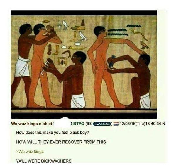 >>524468309>>524467668Ancient Egyptians:>smart>royal>religious>astronomers>mathematicians>architects>artists>family and lineage orientedNegroes:>not particularly smart>peasants and slaves>no concept of God whatsoever>couldn't give a fuck about stars or planets>zero mathematical discoveries>haven't built anything of value for 10,000 years of known history>peak of their art is mumbling into a microphone>can't even decide which man is their fatherYeah, these groups are as far from each other as humanely possible.