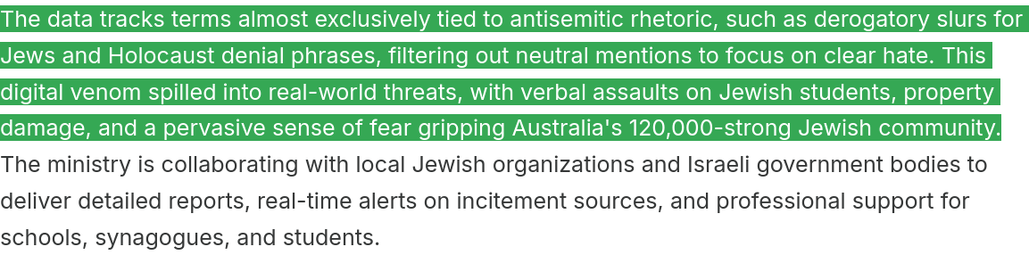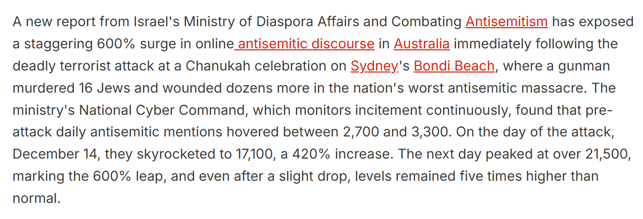 >>524471188In the article it says they search for keywords and phrases that are frequently tied to hollyhoax denial and derogatory slurs in all posts made on social media. https://www.jfeed.com/antisemitism/australia-antisemitism-surgehttps://www.jpost.com/diaspora/antisemitism/article-881447
