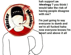 >>524475438During Bidens administration he would just tweet “lol” or “lmao” every time an article would come out about biden doing something. It was like TDS but for the dementia manHe also uses his cope laugh on stream as a constant defence, when he mocked Sargon for doing the smug chuckle, which are effectively the same thing. He exhibits a lot of mannerisms of those he’s mocked. He’s like Walter White in that regard, but gayer>cope laugh = Sargon smuckle>cried on video like Jarbo did>calls in a pity party for his health like Spoony did>ebegs like DSP does>goes on unhinged hollers like The Gunt does>overshares his private life like Wings does >gets all super serious and spouts dumb politics like the sceptics did