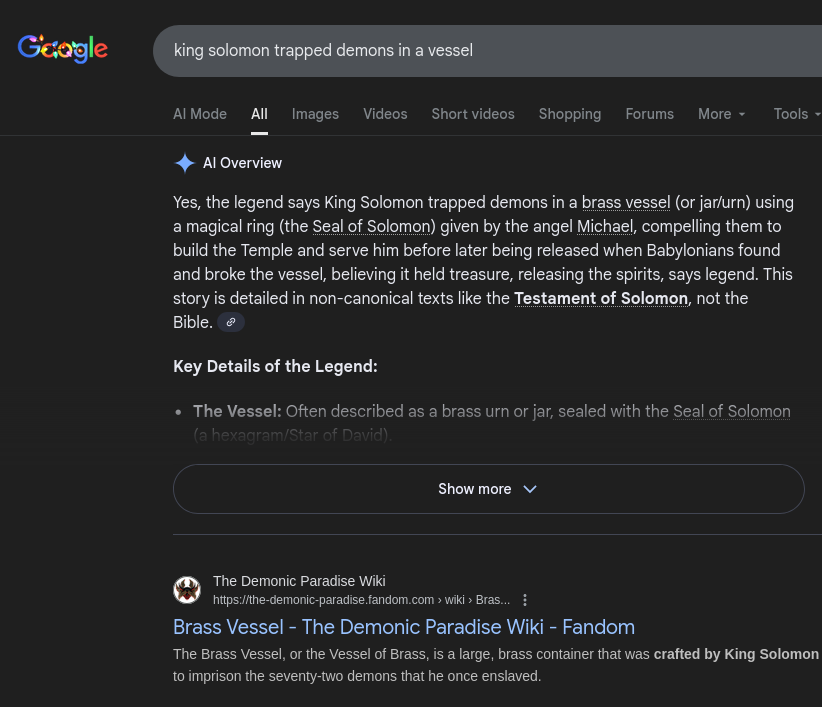 >>524476535It's pretty interesting where the genies idea came from.God gave King Solomon a ring which gave him power over demons, and he sealed them in a brass vessel (lamp/pandora's box).https://www.youtube.com/watch?v=0ARaDO2KHCY1:29:50