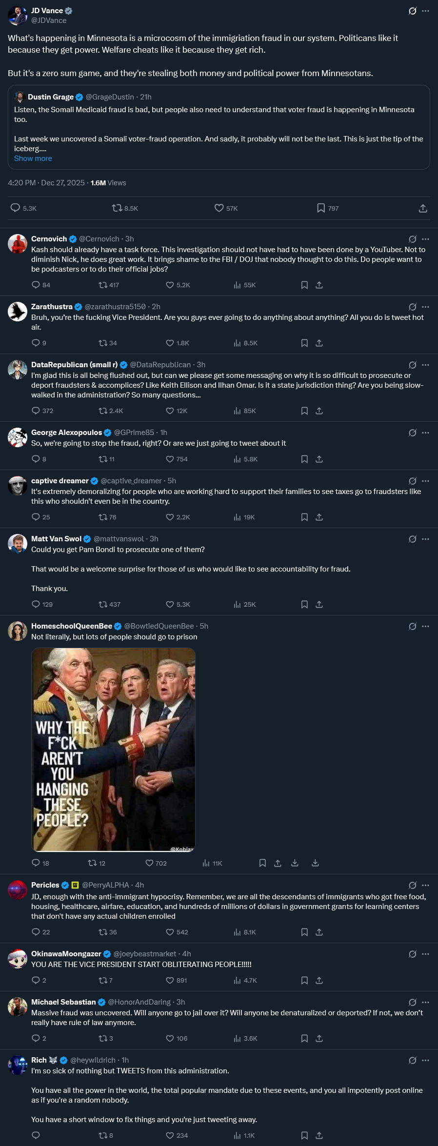 >>524481520US congress is not in charge of US law enforcement. The DOJ is, under Trump's authority.The Somalis and their associates in Somaliapolis have openly violates many federal laws with a terrorism connection. You could easily mass-arrest tens of thousands of people for federal fraud, money laundering, and terrorism charges using RICO and the Patriot Act. And even put them into GITMO. Including Tim Walz.We know the Somalis aren't blackmailing Trump, no way do they have the Epstein files. So we have to assume that Trump and his administration are tacitly working with the Somalians and Tim Walz, because there's simply no other excuse with the plethora of options available to the US DOJ to prosecute.
