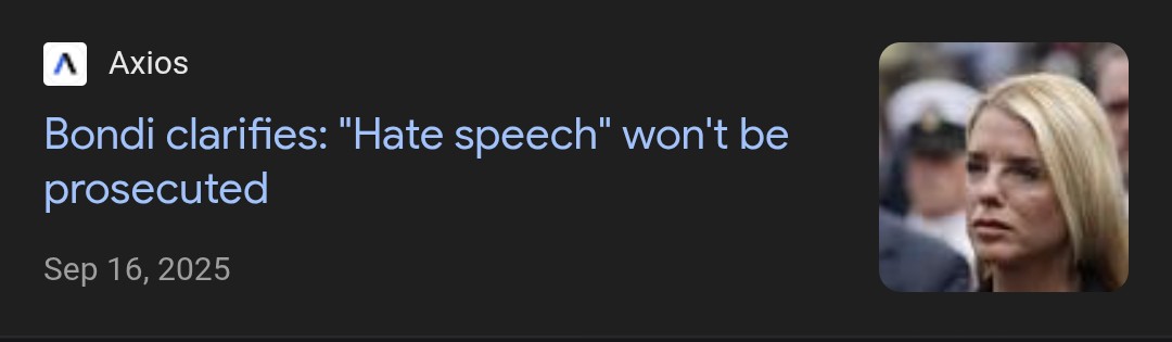 >>524480551>This is hate speech. Literally targeting Americans.Correct En cringing law, by false pretext or lie in public.* real bullet would tear tissue apart making mess , so it was no bullet at allProsecute Charlie Kirk for a fraud and Pam Bondi as complices.1, created false pretext staged event another confirm obvious hoax and 2. suggest illegal solution to non existing cause.