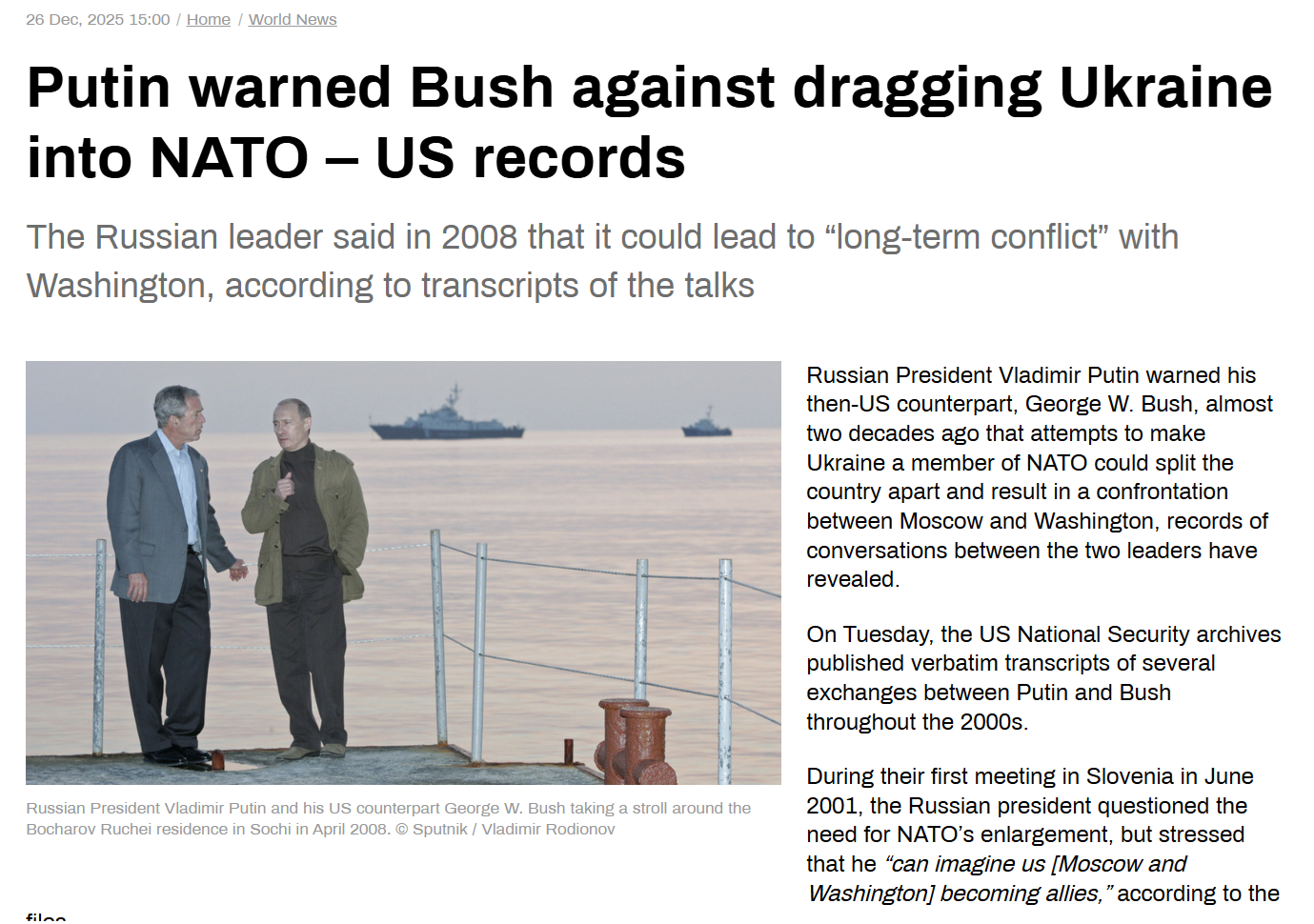 >>524503074>If we read Russia’s military build-up through a defensive lens, recognising their primary interest as preventing Western military expansion or the stationing of Western troops in Ukraine, an invasion of the country would result in just the opposite. An invasion of Ukraine would force Western countries to increase their own military preparedness for war with Russia, if not mobilise to act in defence of Ukraine, further reducing Moscow’s security.See, that's exactly the problem, all of these analyses were based on the premise that Putin isn't retarded. >>524503241>they all knew ukraine joining NATO was red line and would cause a war,Ukraine didn't join NATO, Ukraine wasn't about to join NATO, there was only vague promise that sometime in the future, Ukraine might join NATO.Not even the Russians are insane enough to claim that Ukraine potentially joining NATO sometime in the future is a sufficient casus belli *now* The actual Russian justification for the war is that - Ukraine attacked first - Ukraine was about to invade Donbass - Ukraine was genociding the native population of Donbas for 8 years - Ukraine is run by (jewish) nazis who oppress the Russian speaking population - Secret U.S.-funded biolabs in Ukraine were developing genetic weapons targeting exclusively Russians that would be spread into Russia using specially trained migratory birds (lol)