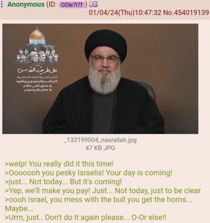 >>524507342>Iran is threatening to release this information to Israel opposition party, which would result in the IMMEDIATE ARREST OF NETANYAHUPlease, as much as I would like to see Pissrael disappear in a nuclear blast, if Iran had that sort of information at it's disposal, they wouldn't threaten with releasing it, they would just release it.