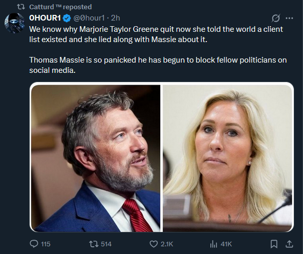 not looking good folx...We know why Marjorie Taylor Greene quit now she told the world a client list existed and she lied along with Massie about it.Thomas Massie is so panicked he has begun to block fellow politicians on social media.https://x.com/0hour1/status/2005326884272538085