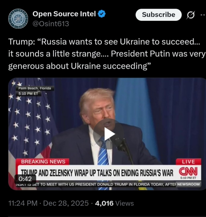 Trump just now:"Russia wants Ukraine to succeed. President Putin was very generous about Ukraine succeeding"https://x.com/Osint613/status/2005404638447862155xD