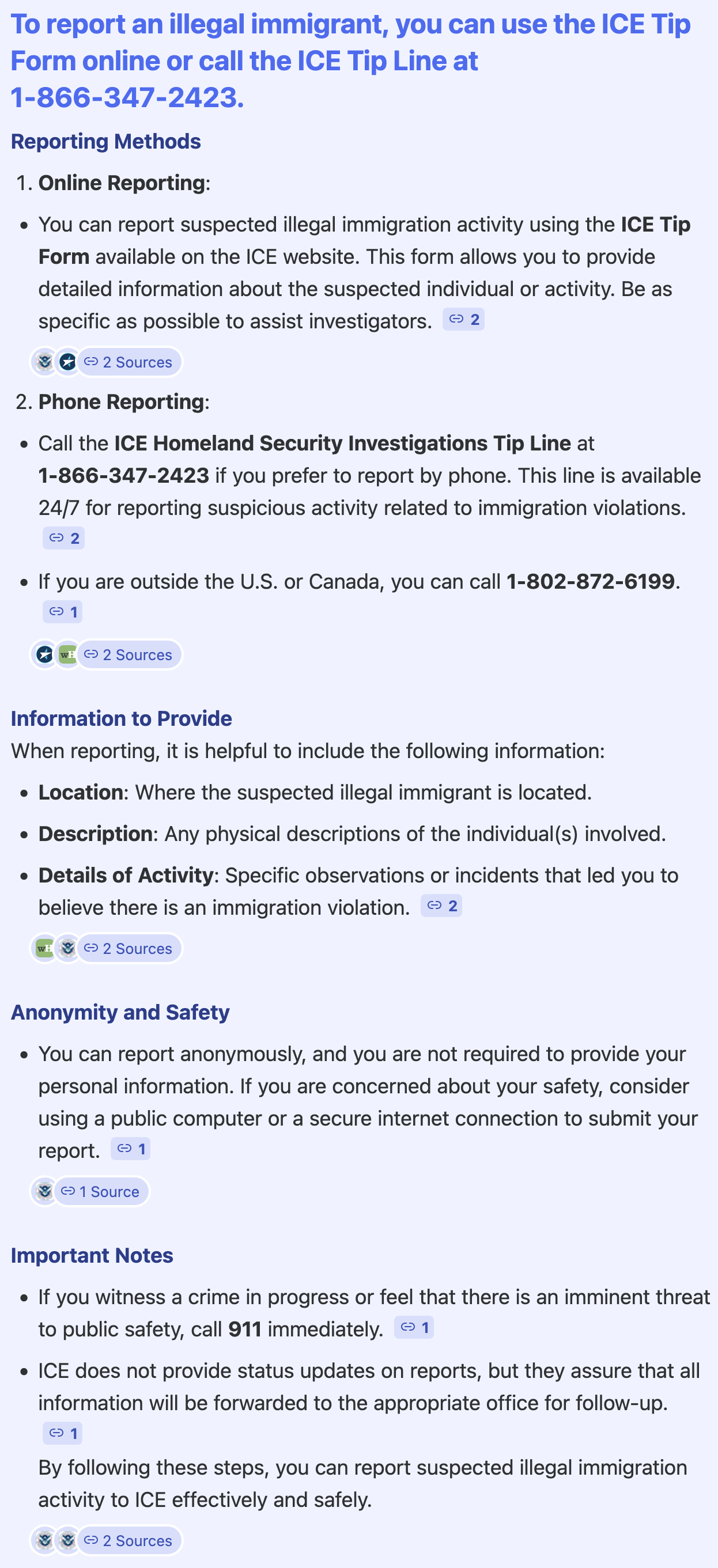 To report suspected immigration violations to U.S. Immigration and Customs Enforcement (ICE), you can call their toll-free tip line at 1-866-DHS-2-ICE (1-866-347-2423) or use the ICE online tip form, providing as many specific details as possible, such as names, locations, and descriptions, to help investigators, with options for anonymity if needed. How to ReportBy Phone: Call the ICE Tip Line at 1-866-DHS-2-ICE (347-2423). Online: Use the ICE tip form on the official ICE website.