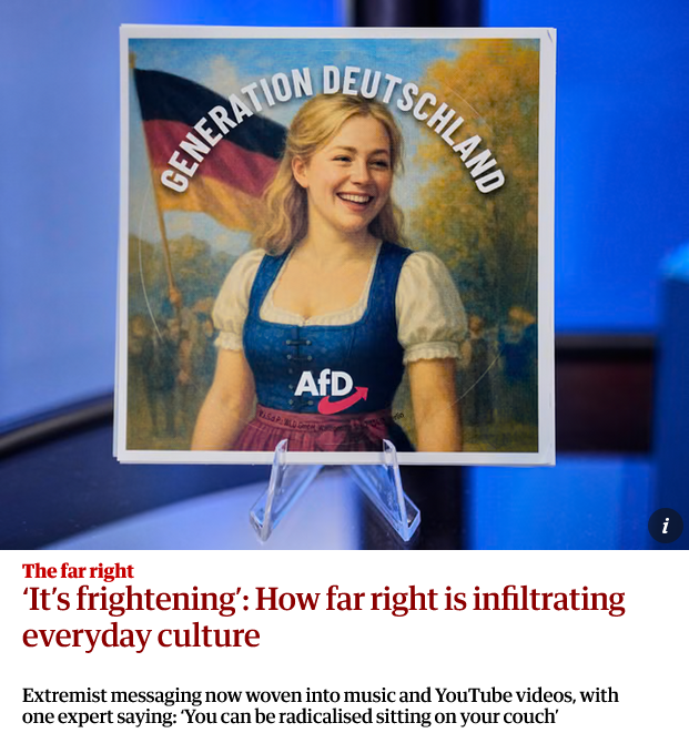 https://www.theguardian.com/world/2025/dec/27/its-frightening-how-far-right-is-infiltrating-everyday-culture>The two men chop peppers, slice aubergines and giggle into the camera as they delve into the art of vegan cooking. Both are wearing ski masks and T-shirts bearing Nazi symbols.>“It’s frightening, honestly,” said Katherine Kondor, a researcher with the Norwegian Center for Holocaust and Minority Studies. “You can be radicalised sitting on your couch.”>“I have a stepson who sometimes sends videos and then I go down the rabbit hole to see who created them and it turns out it’s a far-right influencer.”>“They’ve also started their own food delivery,” she said. “It’s just wild that you can be ordering food from the far right and not know.”