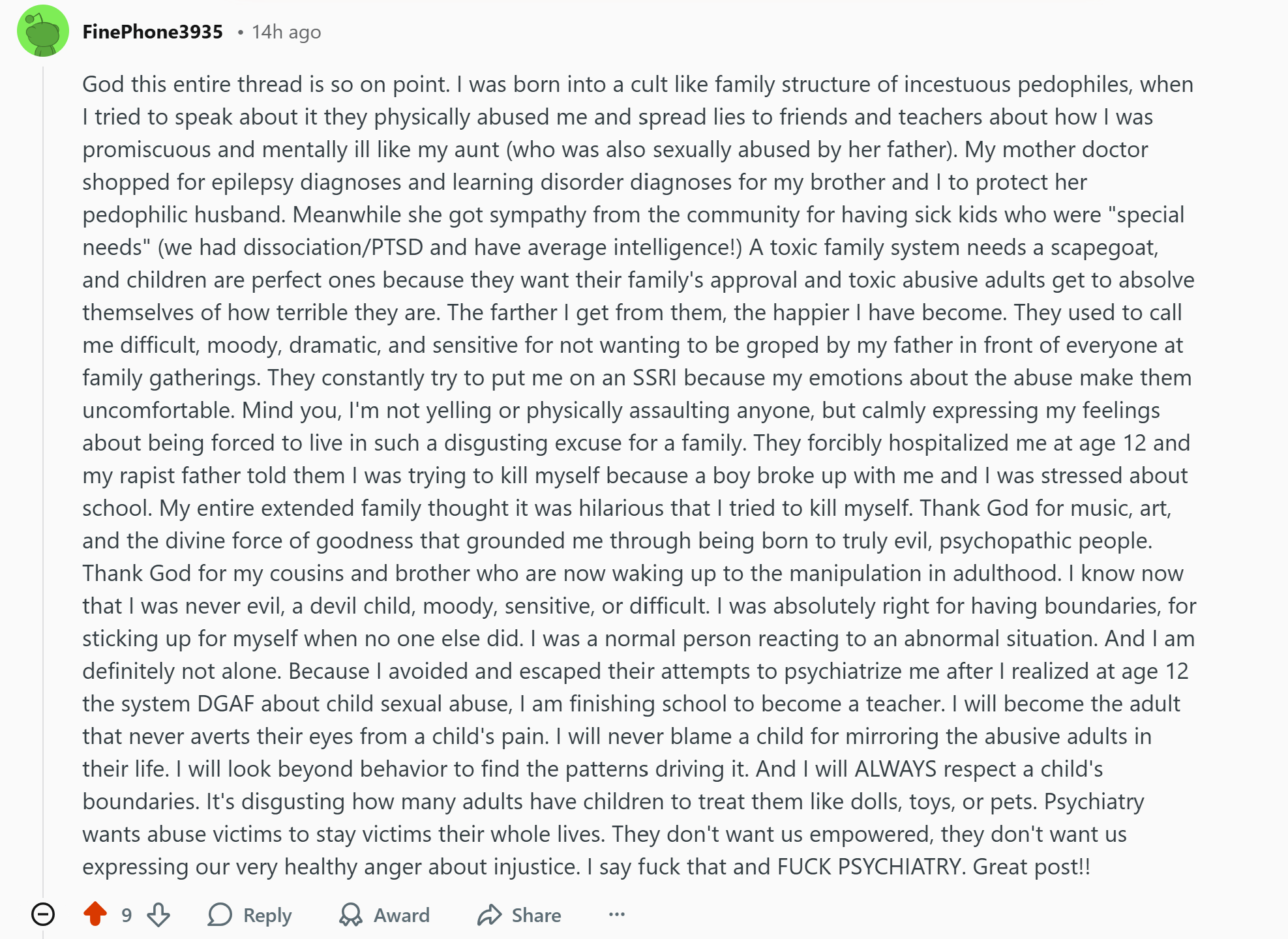 >>524553414How does someone like this not just get a gun and mow down their pedophilic family years later?