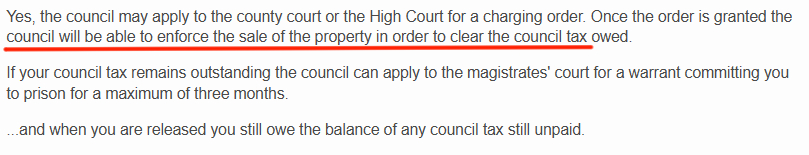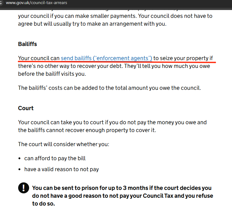 >>524573360Once a liability order has been granted, then, unlike Scotland, there is no limit in legislation as to how long the Council Tax arrears remain outstanding. This allows a local authority to chase debts many years after the original liability order was granted. Councils can garnish wages, send bailiffs to seize property, and imprison people[f] for three months.[38]>very cool, thank you