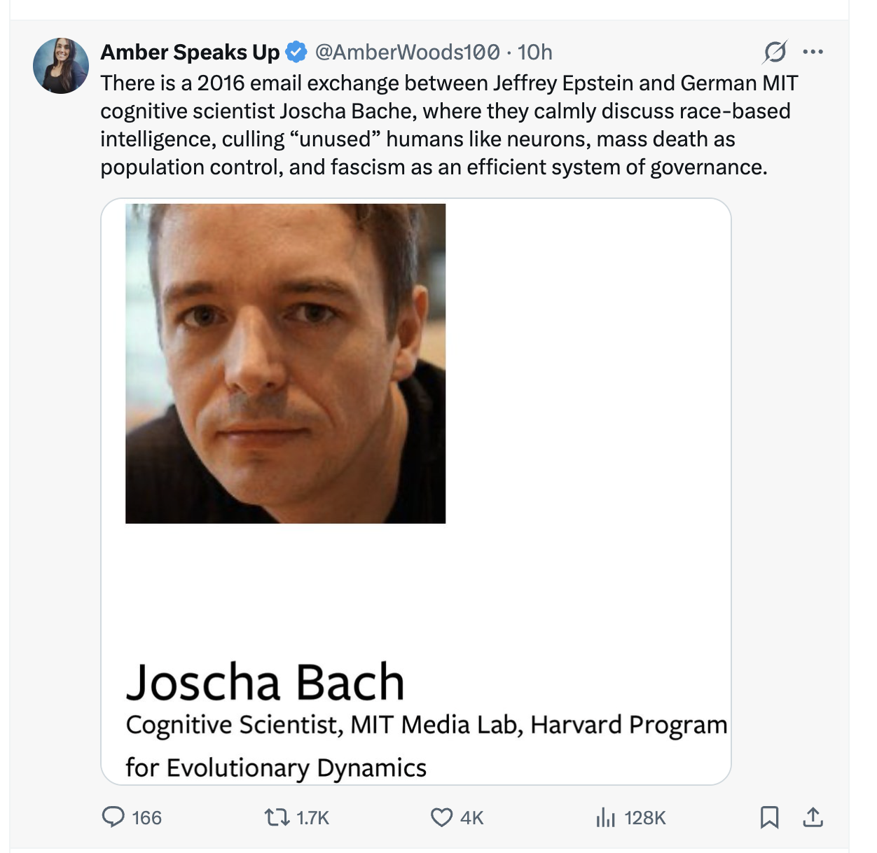 >There is a 2016 email exchange between Jeffrey Epstein and German MIT cognitive scientist Joscha Bache, where they calmly discuss race-based intelligence, culling “unused” humans like neurons, mass death as population control, and fascism as an efficient system of governance.