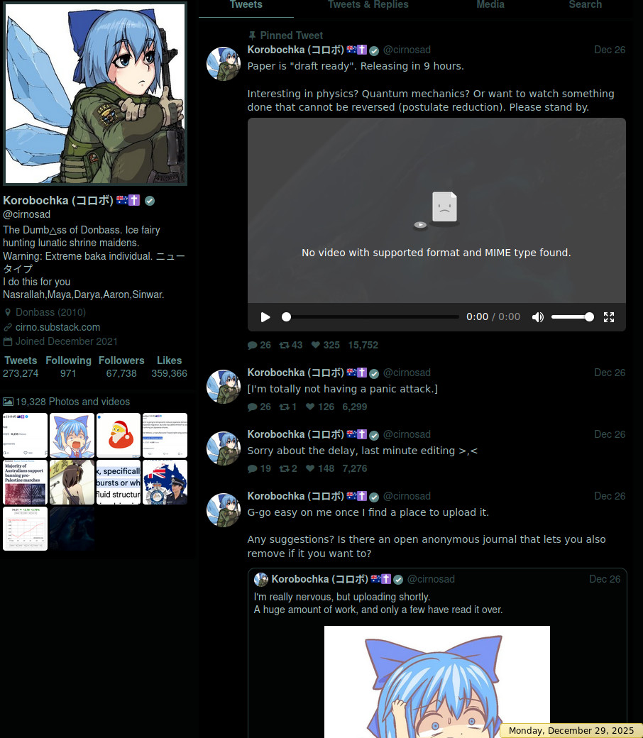 Here is the retarded schizo spamming this shitMichael Birkmier AKA Mikeeusa 301 Ocean Ave. Islip NY. <-- confirmed real locationAKAMikhail KvaratskheliaThread about him on the farms..st/threads/mikeeusa-michael-mcallister-mikhail-kvaratskhelia.19315/>>524565444There is no indication that what this 'cirnosad' was posting was actual science. He's just a schizo with schizo followers. He probably was forced to take his meds and decided to not release his schizo grifter nonsense to have it torn apart by actual physicists.