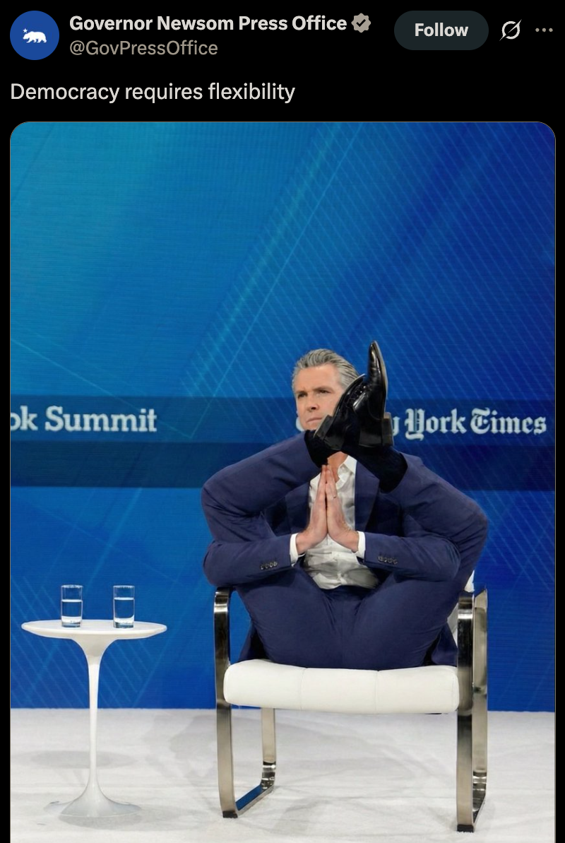 >>524571347It really feels like newsom is just american trudeau, which in turn is a canadian macron. They look like low effort reskins