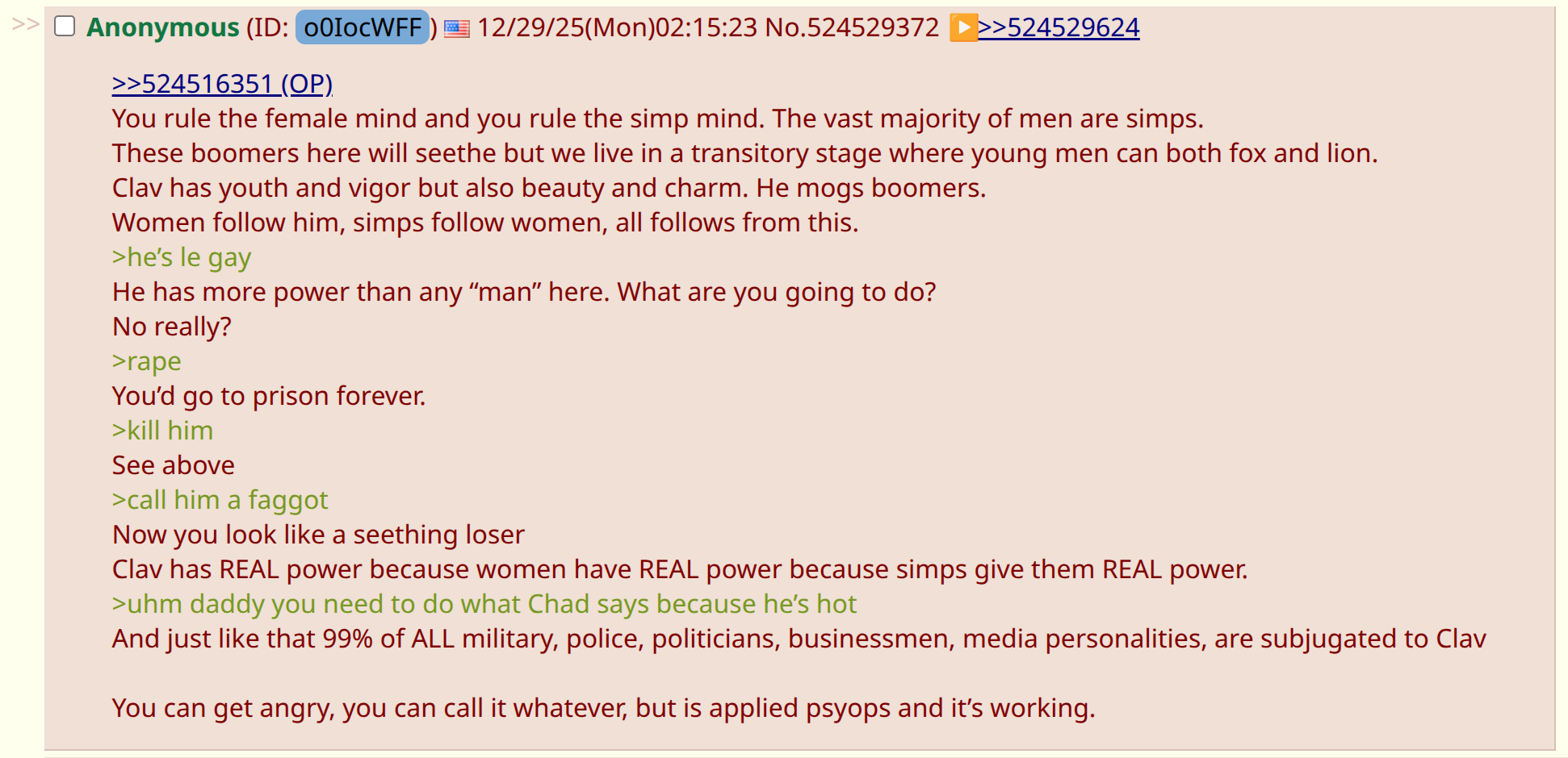 >>524576861nah i don't run away like a pussy or think clavicular is anything but an impotence meme for dumbasses. i'll be fine