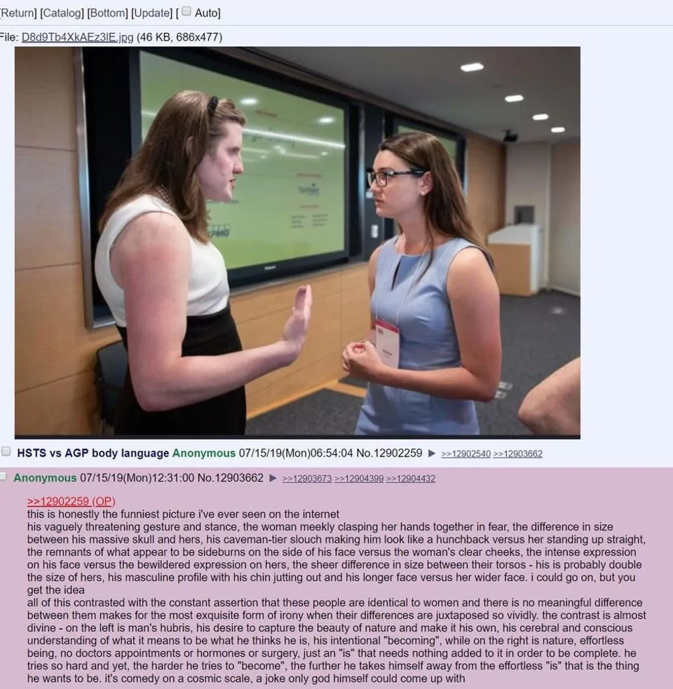 >>524584021I disagree with your assessment as a universally applicable theory.I wont deny the existence of horrific ogre men that have deluded themselves into thinking they are petite anime lesbians, but im fairly sure those are just mentally ill men who have latched onto the trans zeitgeist. In another time and place theyd be building model trains, going to weird sex clubs, or doing war crimes. Just run of the mill weirdos ranging from harmless to terrifying who see the trans thing as something they are "allowed" to latch onto publically.That aside, i think reducing all trans people to that position is disengenious. I know what i look like in the mirror, or at least think i do. If anything, ive deluded myself into thinking i look worse than i do specifically because of the insecurities ive honed in on that other people might not register. My dysphoria about my physical body is about seeing the objective truth of things and beind disatisfied with it.A really really easy way to tell the diff between a realtroon and a faketroon is that realtroons talk about dysphoria (aka feeling bad about themselves) and faketroons talk abouf euphoria (feeling good about themselves).