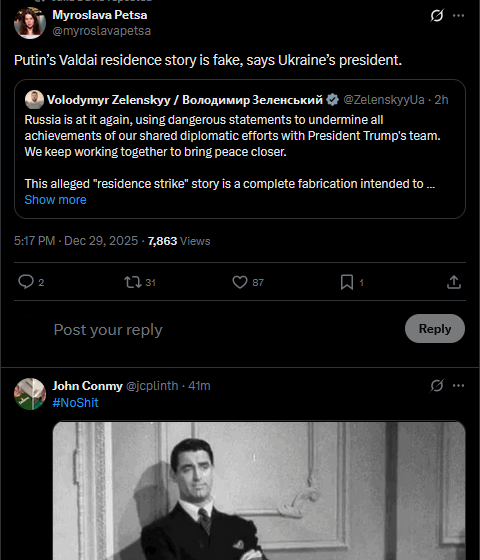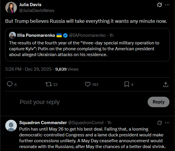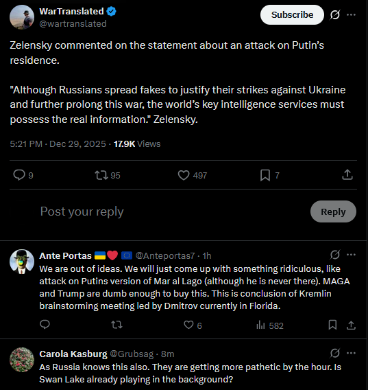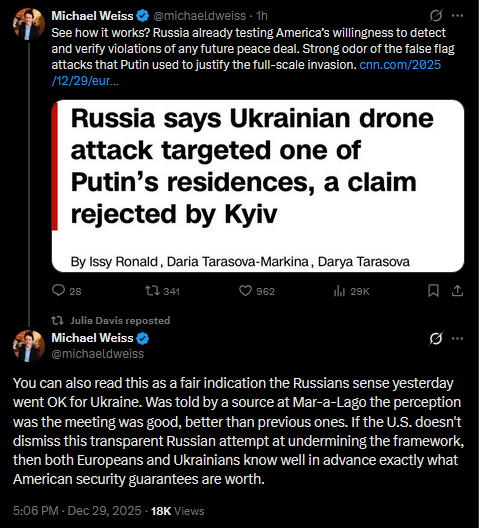See how it works? Russia already testing America’s willingness to detect and verify violations of any future peace deal. Strong odor of the false flag attacks that Putin used to justify the full-scale invasion. https://cnn.com/2025/12/29/europe/russia-claim-ukrainian-drone-attack-putin-residence-intlhttps://x.com/michaeldweiss/status/2005686787432206618?s=20You can also read this as a fair indication the Russians sense yesterday went OK for Ukraine. Was told by a source at Mar-a-Lago the perception was the meeting was good, better than previous ones. If the U.S. doesn't dismiss this transparent Russian attempt at undermining the framework, then both Europeans and Ukrainians know well in advance exactly what American security guarantees are worth.