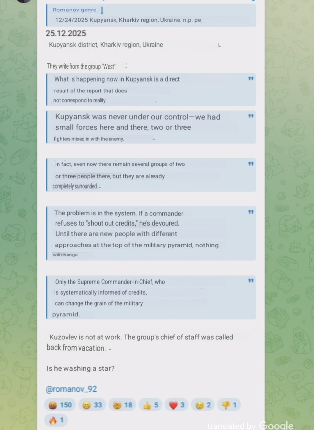 >>524578682>kupyanskZ milblogger Romanov is again lashing out over Kupyansk. He claims the town was never truly held by Russian forces, only scattered 25-12-2025 p