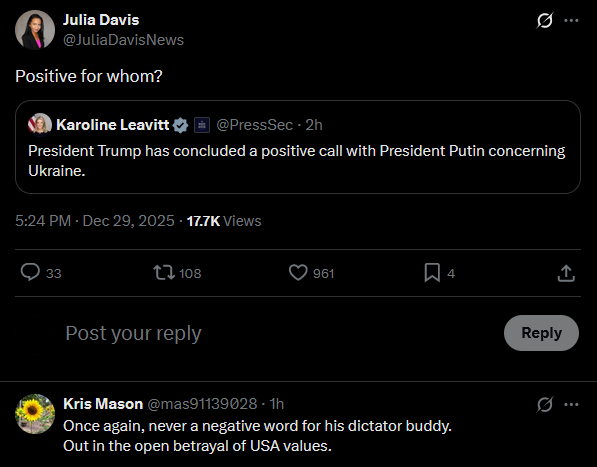 >>524578643Positive for whom?https://x.com/JuliaDavisNews/status/2005691456737140826?s=20>President Trump has concluded a positive call with President Putin concerning Ukraine.
