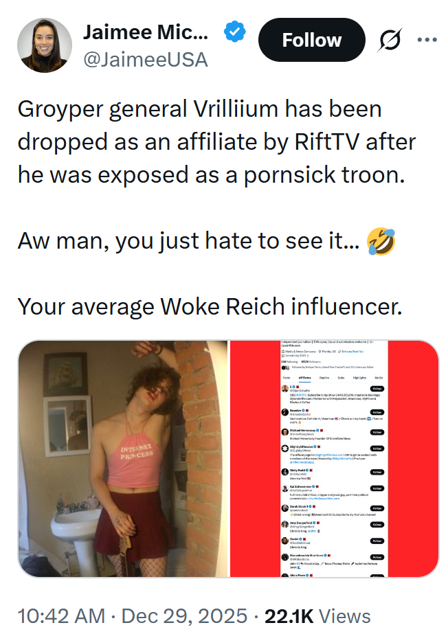 So dressing up as a woman gets you cancelled as a rightoid influencer? I thought it was basically a requirement.