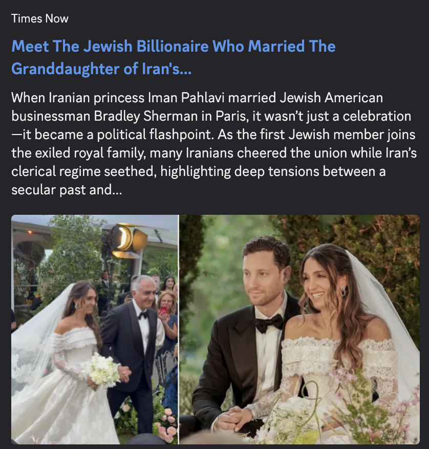 >>524588804Yes. Also his daughter just married a kike a few months ago. Pahlavi is literally a kike puppet through and through. It's not even a conspiracy it's all out in the openhttps://www.timesnownews.com/lifestyle/people/meet-the-jewish-billionaire-who-married-the-granddaughter-of-irans-last-shah-king-who-was-overthrown-by-ayatollah-khomeini-in-1979-article-152132598