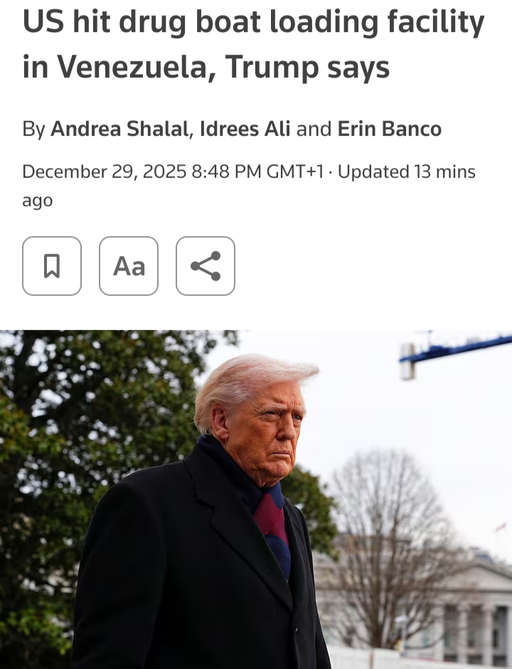 >US hit drug boat loading facility in Venezuela, Trump says>Operation marks first known US activity inside Venezuela>Venezuelan government and US agencies silent on incidenthttps://www.reuters.com/world/us/us-venezuelan-officials-still-mum-trumps-mention-action-against-drug-boat-2025-12-29/