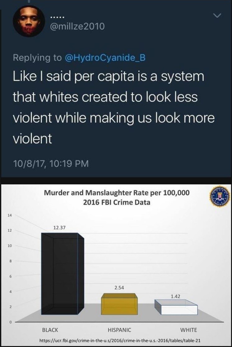 they'll "per capita" some issue republicans or white people are over represented in like mass shootings (which isn't even true because of niggers spray and praying every night in chicago) then pretend is doesn't exist when talking about violent crime or illiteracy etc