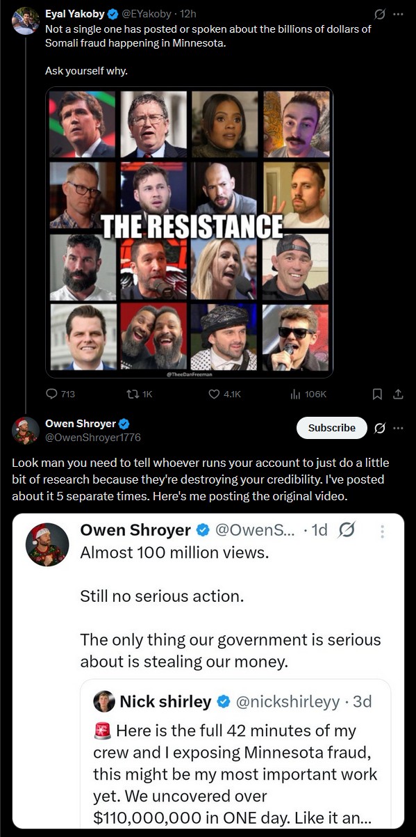Not a single one has posted or spoken about the billions of dollars of Somali fraud happening in Minnesota.Ask yourself why.